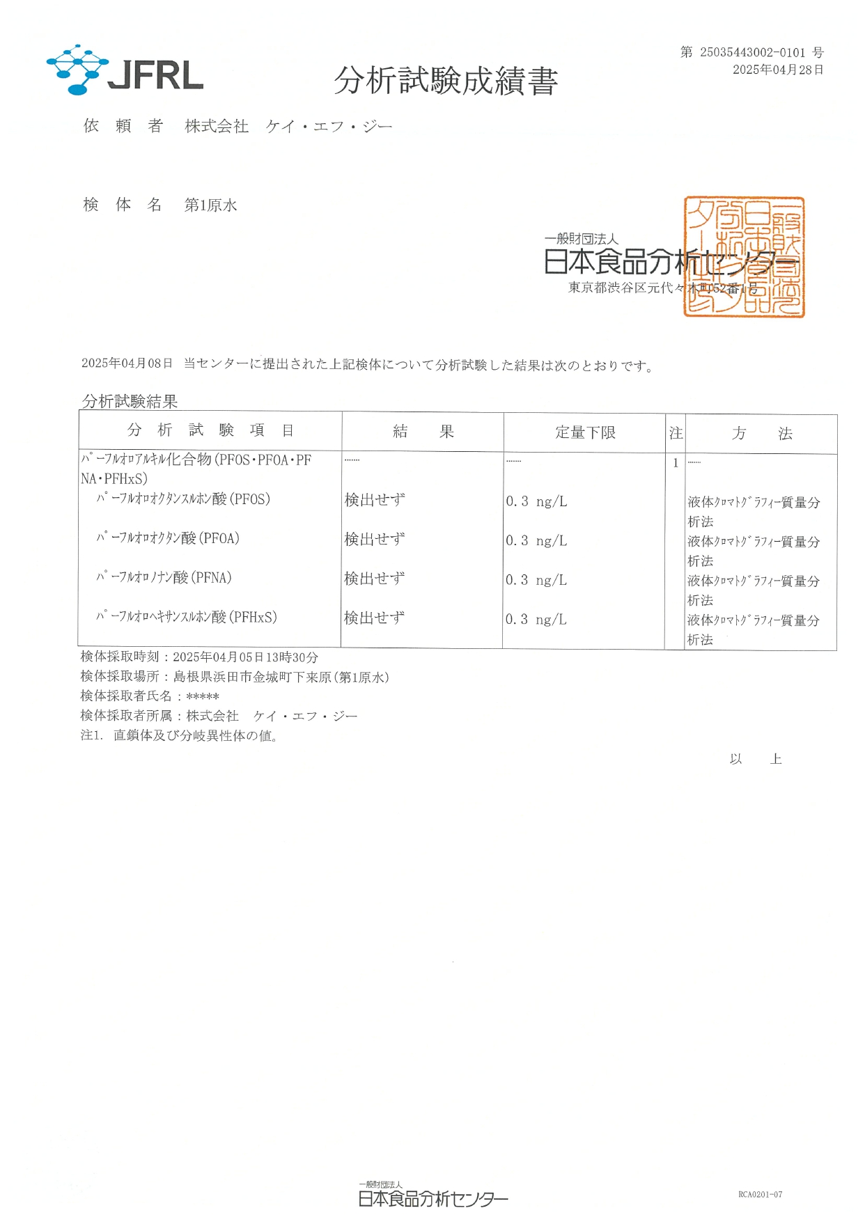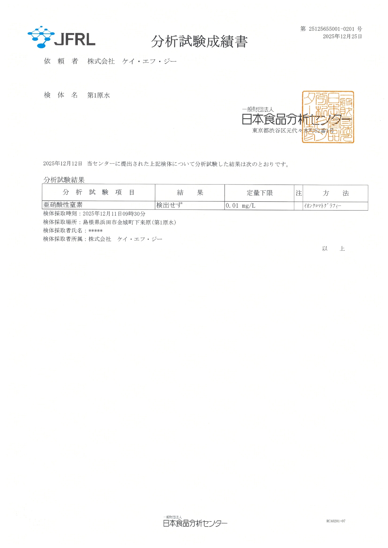 日本食品分析センターの分析結果において、硝酸態窒素が検出されなかったことをご報告いたします。