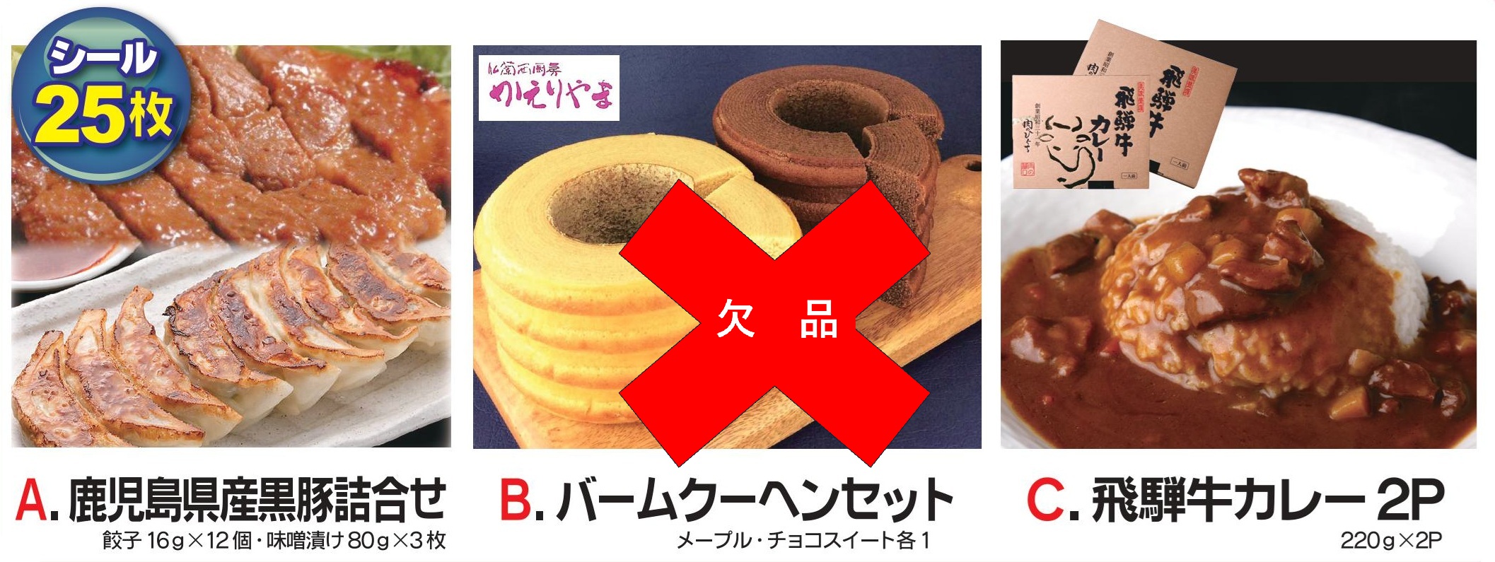 ・25枚:鹿児島県産黒豚詰合せ・バームクーヘンセット・飛騨牛カレー2Pのうちどれか1点