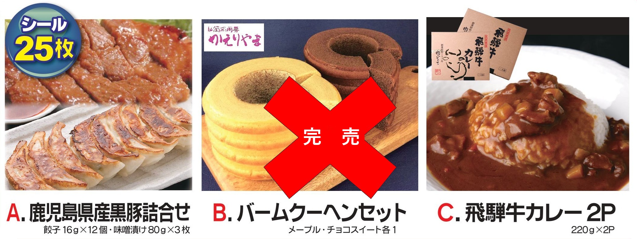 ・25枚:鹿児島県産黒豚詰合せ・バームクーヘンセット・飛騨牛カレー2Pのうちどれか1点